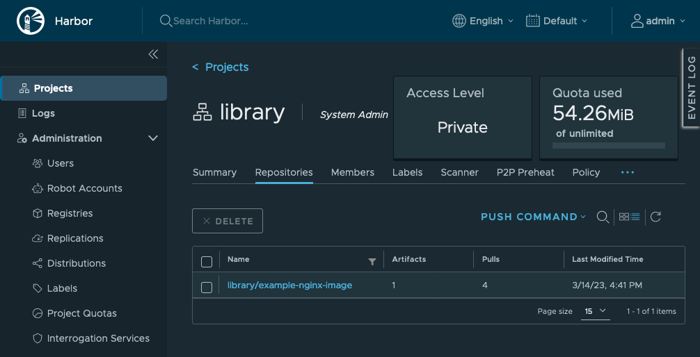 You can go to the Harbor dashboard in your browser to see the results. Navigate to the Projects page using the menu on the left, and select the library project from the listing. You should see your image listed.